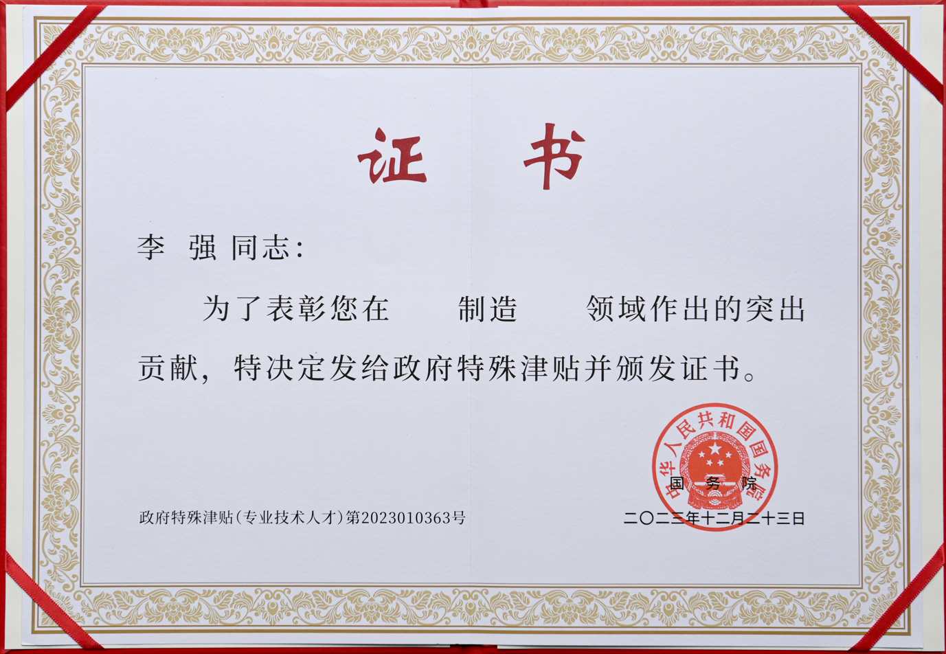 吉林Z6·尊龙凯时「中国」官方网站电子股份有限公司副总经理李强获授国务院政府特殊津贴