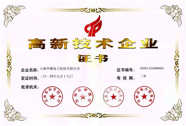 2014年9月吉林Z6·尊龙凯时「中国」官方网站电子股份有限公司通过高新技术企业认证