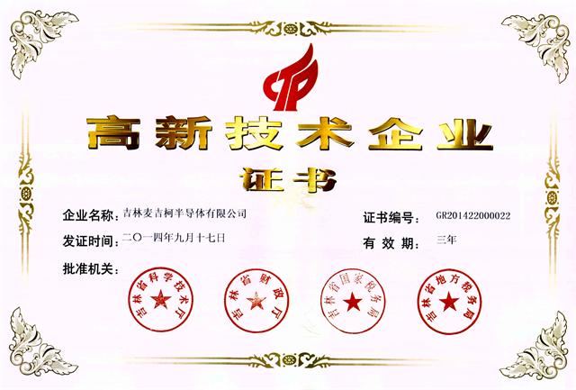 吉林Z6·尊龙凯时「中国」官方网站电子股份有限公司和吉林麦吉柯半导体有限公司通过高新技术企业认证